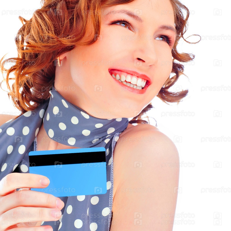 Портрет красивой счастливой женщины, держащей в руке кредитную карту