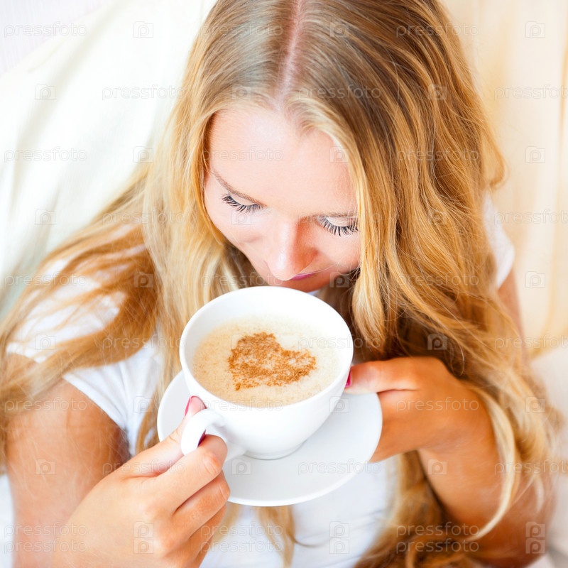 Молодая женщина вдыхает аромат кофе с изображением сердца на пене