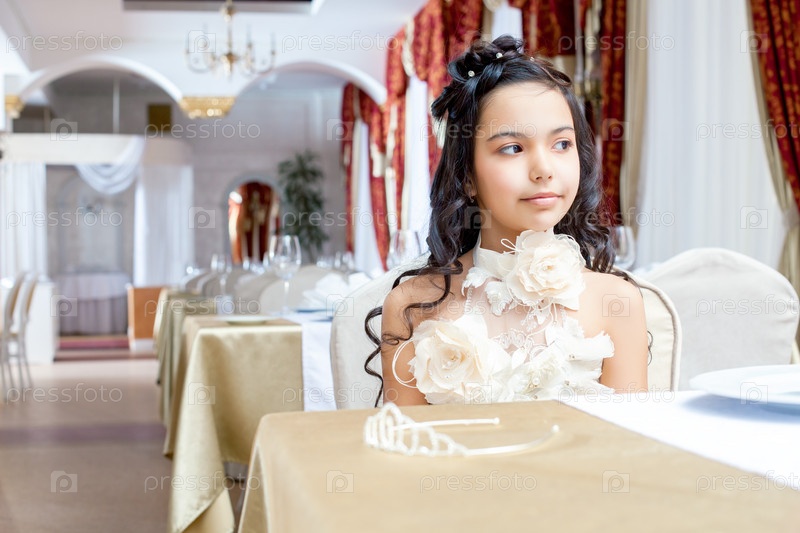 Девочка с платье принцессы за столом в ресторане