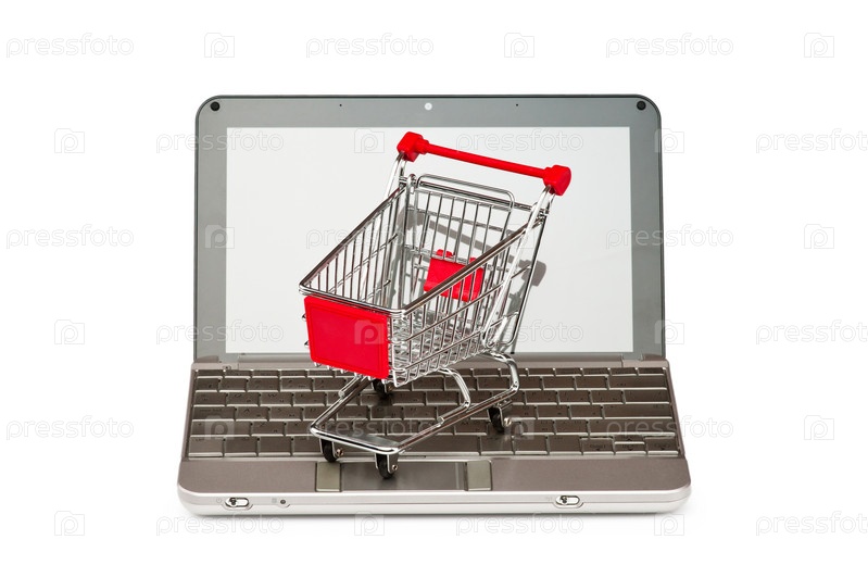 Интернет-покупки, продуктовая тележка и ноутбук на белом фоне