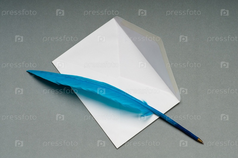 Перо с конвертом на сером фоне