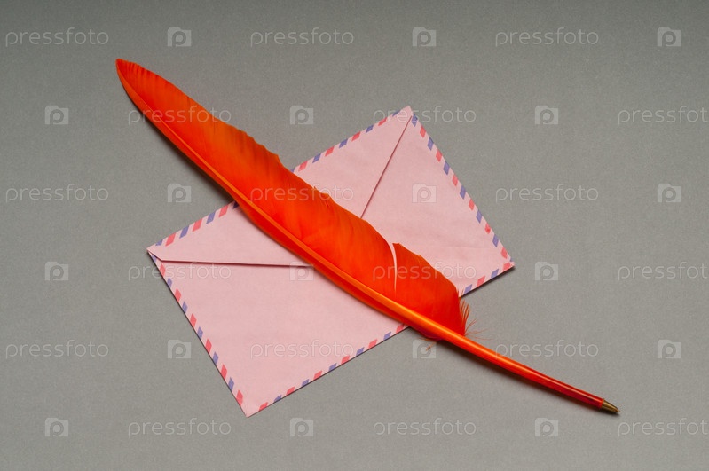 Перо с конвертом на сером фоне