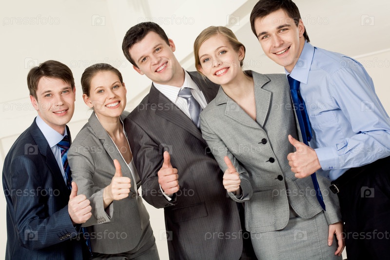 Портрет счастливых деловых партнеров, смотрящих на камеру с улыбками и показывающих признаки согласия
