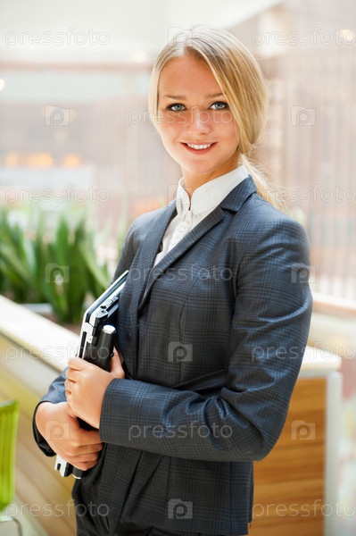 Портрет молодой девушки в деловом костюме с ее ноутбуком в руках