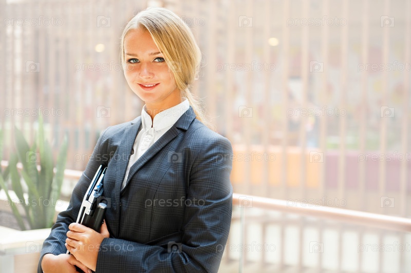 Портрет молодой девушки в деловом костюме с ее ноутбуком в руках