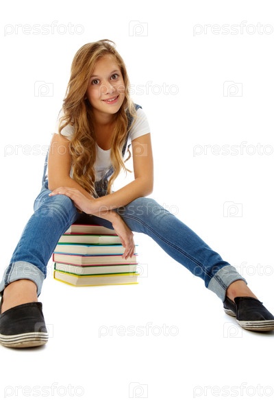 Девушка сидит на книгах на белом фоне