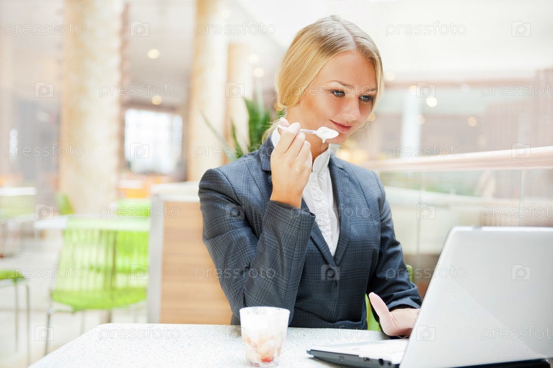 Портрет молодой девушки в деловом костюме, работающей на ноутбуке