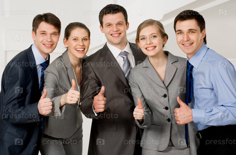 Портрет счастливых коллег, смотрящих на камеру с улыбками и показывающих признаки согласия