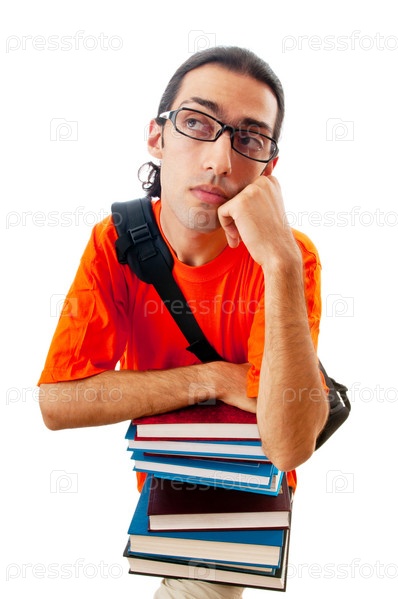 Студент со стопкой книг на белом фоне