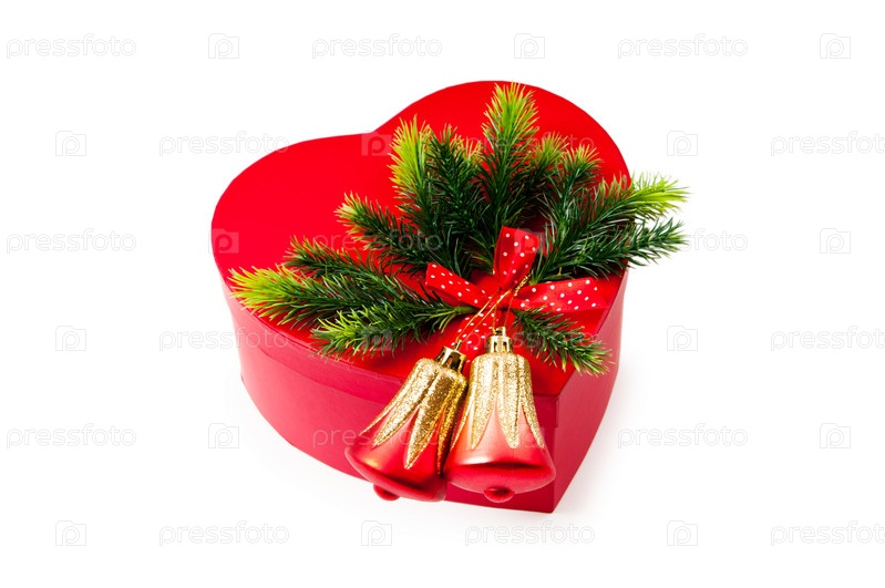 Подарки с елочными украшениями на белом фоне