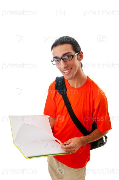 Студент листает книгу, изолированный на белом фоне