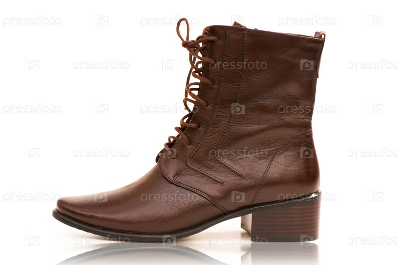 Коричневый кожаный полусапожек с шнуровкой на невысоком каблучке, изолированный на белом фоне