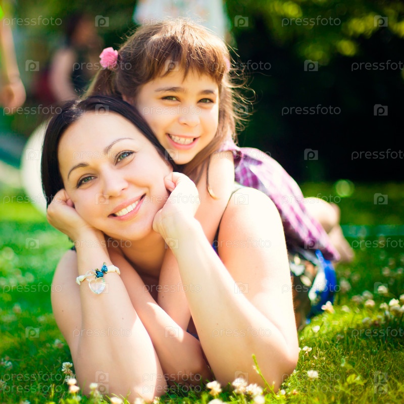 Мама с дочкой на зеленой лужайке