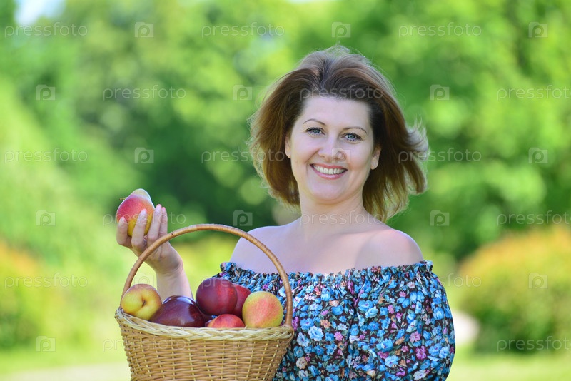 Взрослая женщина с корзиной фруктов в парке