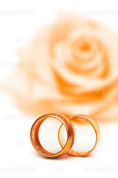 Два обручальных кольца на фоне розы