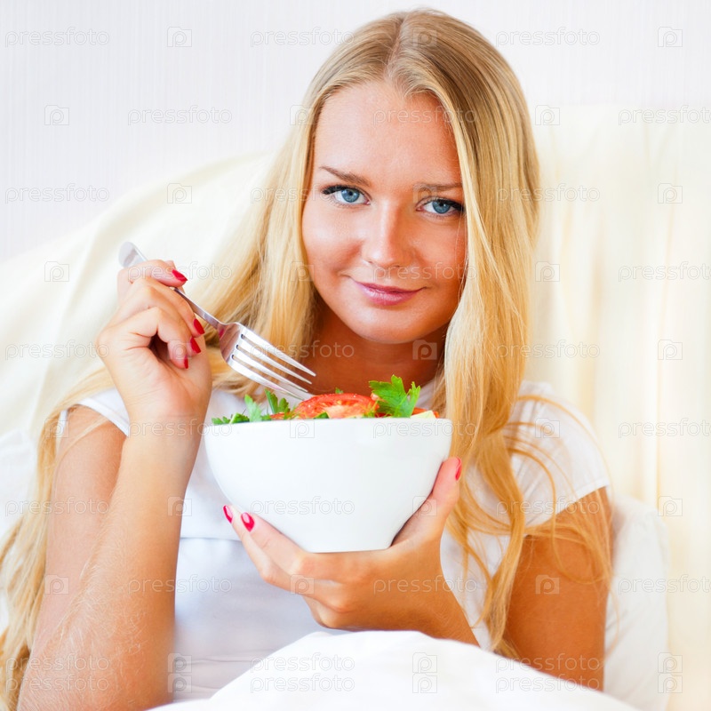 Молодая женщина завтракает в постели