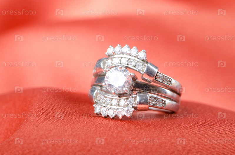 Кольцо с драгоценными камнями на красном фоне