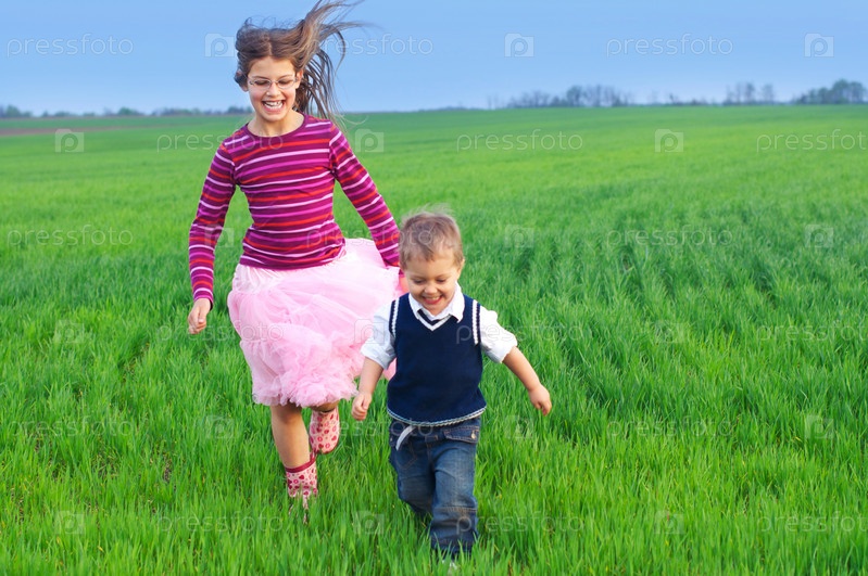 Брат и сестра бегают в поле