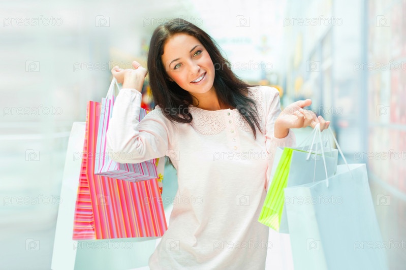 Счастливая девушка с пакетами в торговом центре
