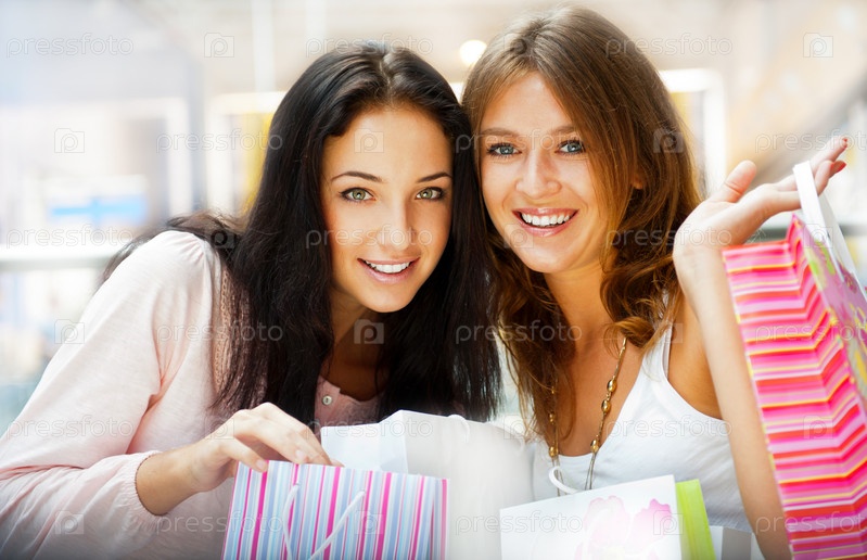 Счастливые девушки с покупками в торговом центре
