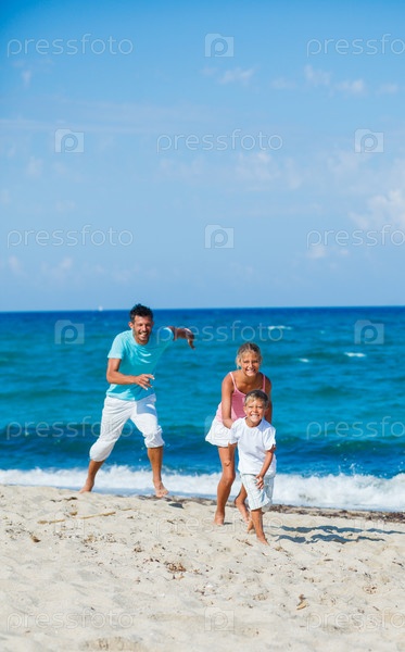 Дети, отец, играя на пляже