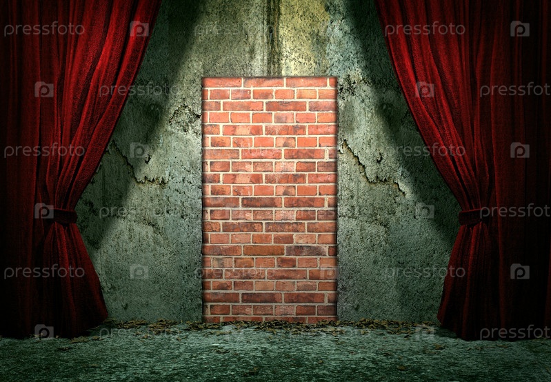 Закрытая кирпичная дверь на стене гранжа и красная занавеска выше (3D визуализация)