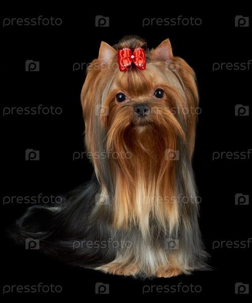 Очень приятно Йоркширский терьер с красным луком и аккуратно ухоженные волосы сидит на черном фоне изолированных