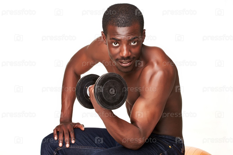 Сильные и мускулистые парень с гантелями, изолированные на белом фоне