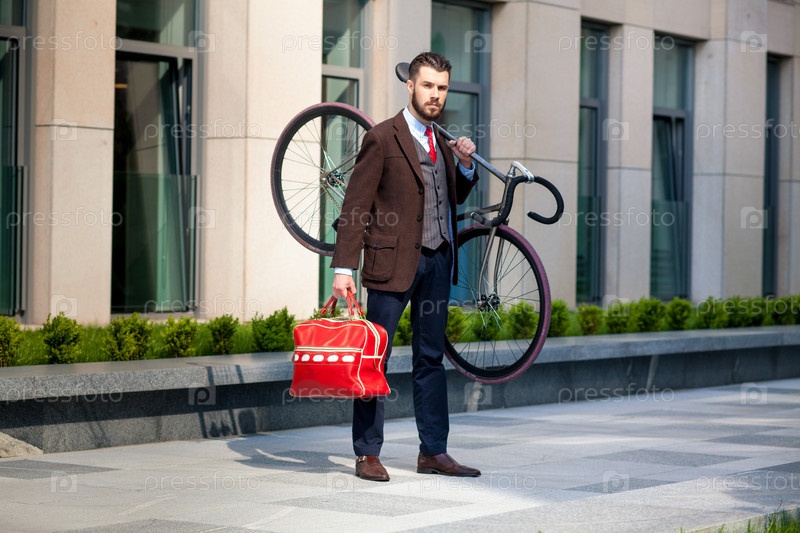 Красивый бизнесмен, перевозящих его велосипедов в офисе
