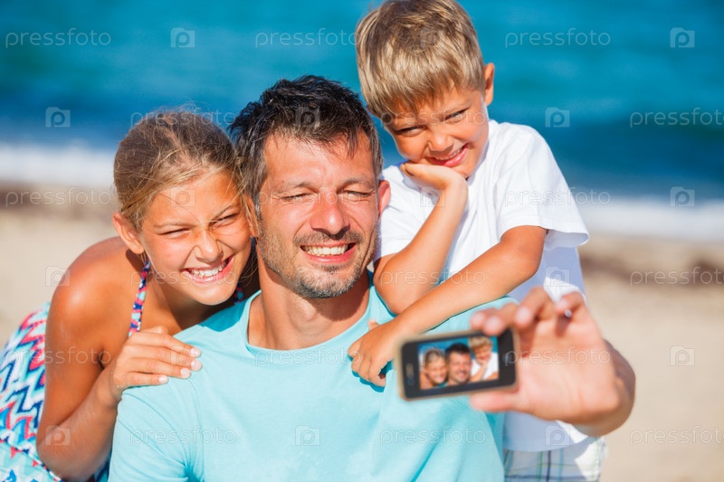 Отец и его дети на пляже делают селфи