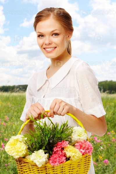 Красивая девушка с корзиной цветов в поле