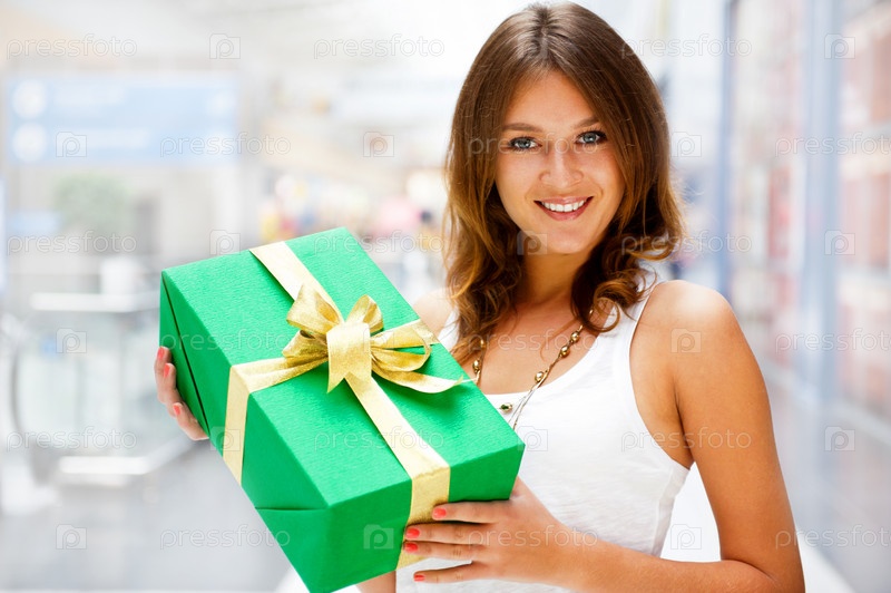 Счастливая девушка с подарком в торговом центре