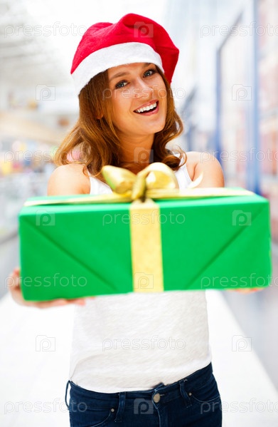 Счастливая девушка в новогоднем колпаке стоит с подарком в торговом центре