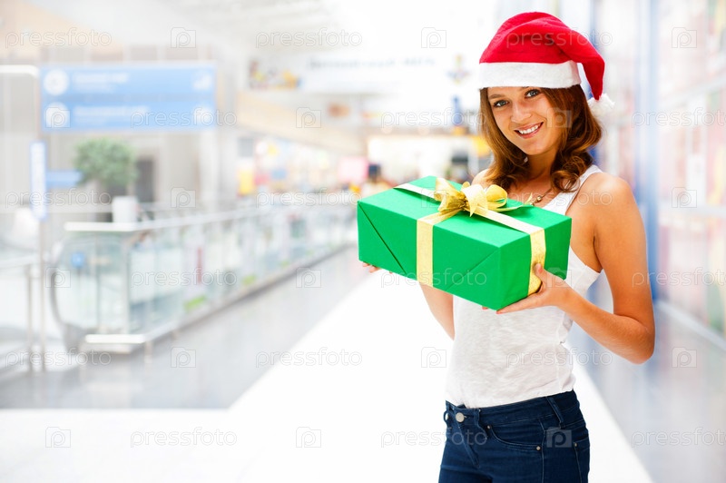 Счастливая девушка в новогоднем колпаке стоит с подарком в торговом центре