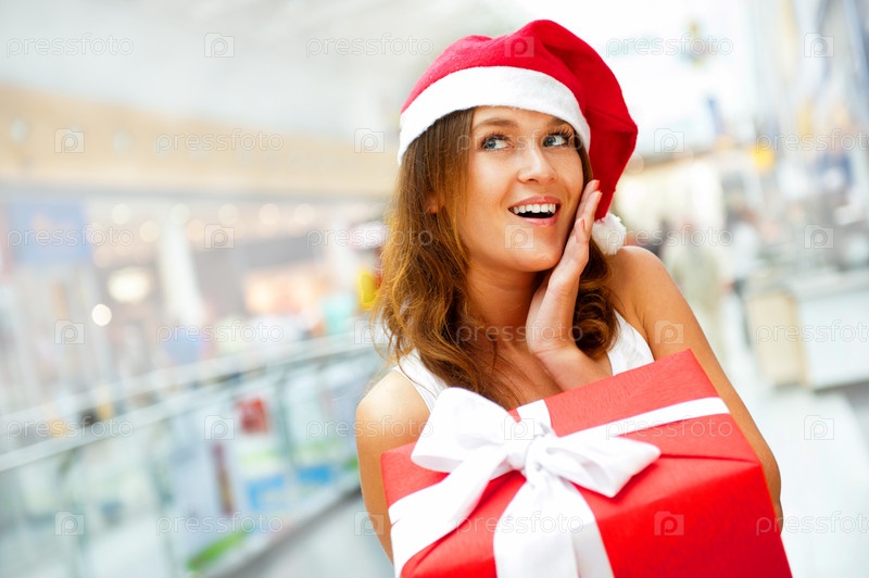 Восторженная девушка в новогоднем колпаке стоит с подарком в торговом центре