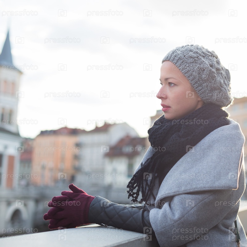 Вдумчивый женщина на открытом воздухе в холодный зимний день