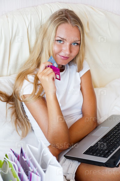 Девушка оплачивает покупки в интернет-магазине кредитной картой