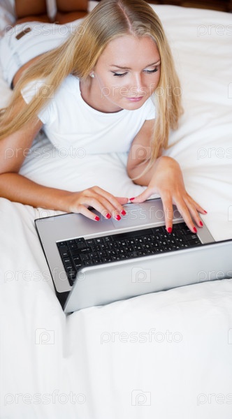 Девушка с ноутбуком лежит на кровати