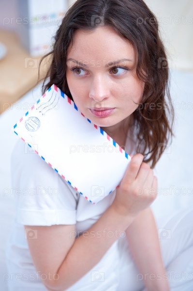 Девушка с письмом сидит на кровати