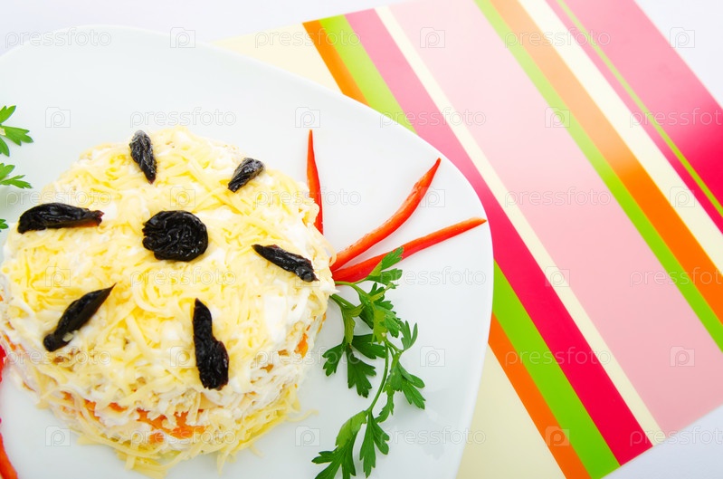 Порционный салат в тарелке на салфетке в разноцветную полоску