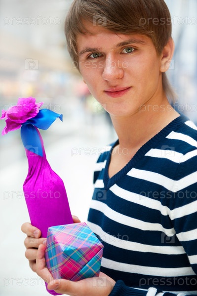 Молодой человек с подарком и красиво упакованной бутылкой вина стоит в торговом центре