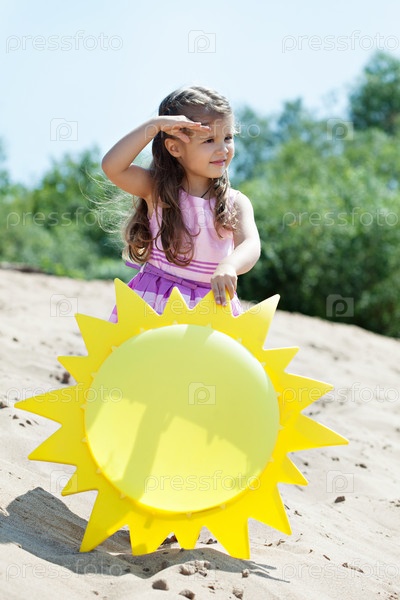 Маленькая девочка на летней прогулке с зонтиком в виде солнца