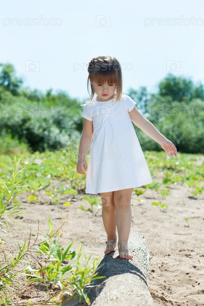 Очень симпатичная девочка летом гуляет босиком по бревну