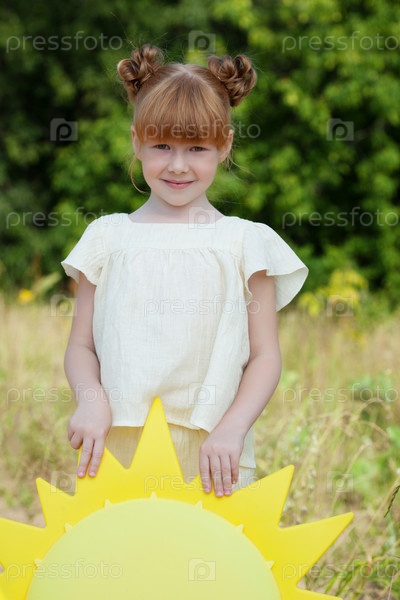 Очень симпатичная девочка на летней прогулке с зонтиком-солнцем