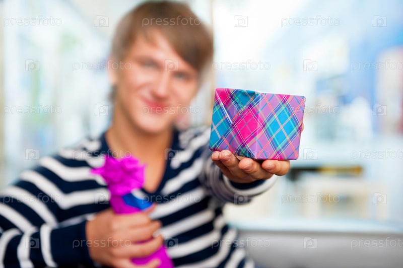 Молодой человек вручает подарок, сидя в торговом центре
