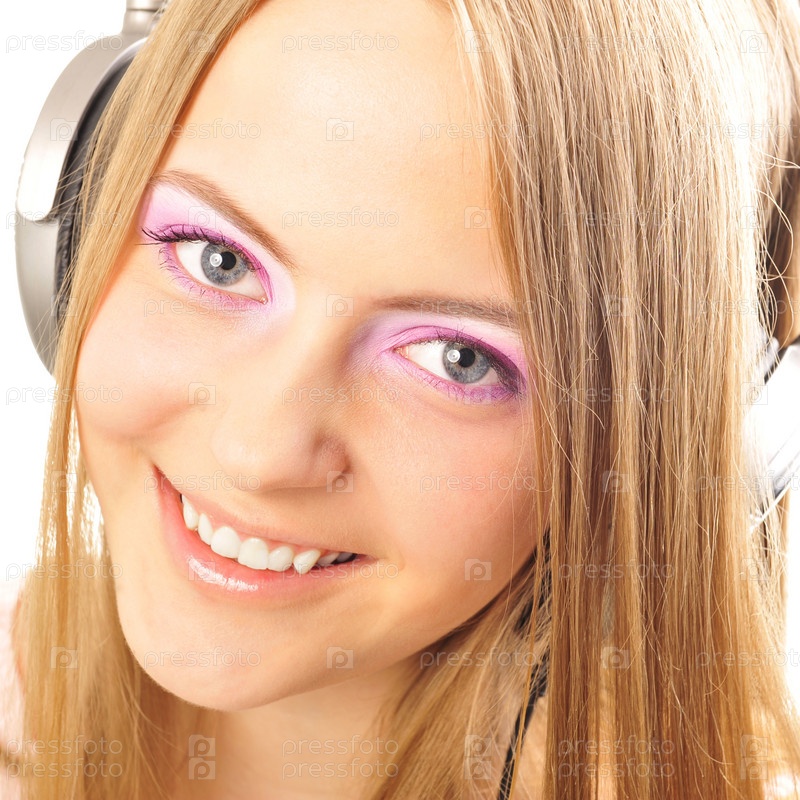 Красивая девушка с ярким макияжем и наушниками на голове, на белом фоне