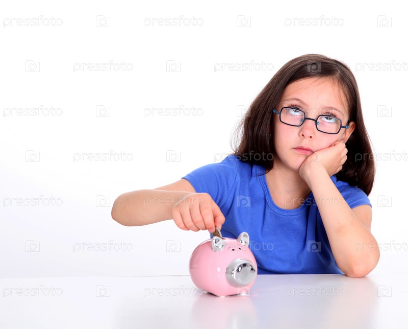 Маленькая девочка опускает монеты в копилку