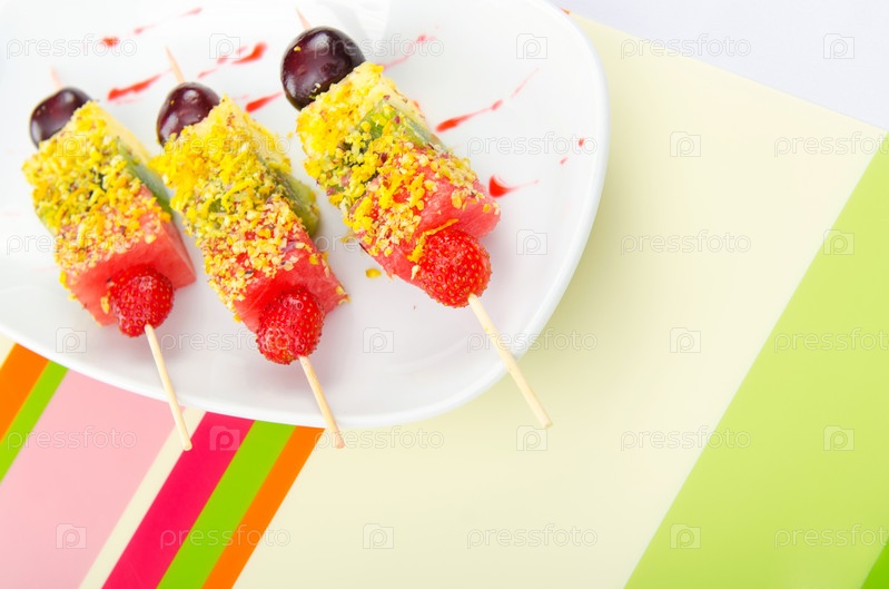 Фруктовый десерт на палочке в тарелке на салфетке в разноцветную полоску