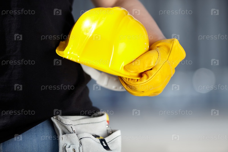 Строитель с желтый шлем и рабочие перчатки на строительство сайта