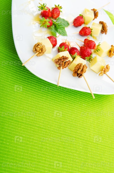 Фруктовый десерт с грецким орехом на палочке в тарелке на зеленой скатерти